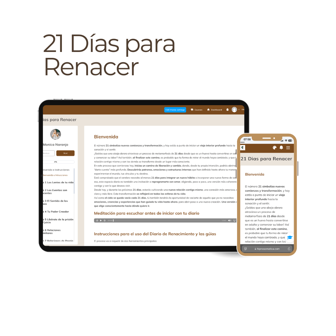21 Días para Renacer es un recorrido profundo para quienes han pasado por un cambio y sienten que algo se apagó. Te guía a soltar lo que te frena a y recuperar tu fuerza interior
